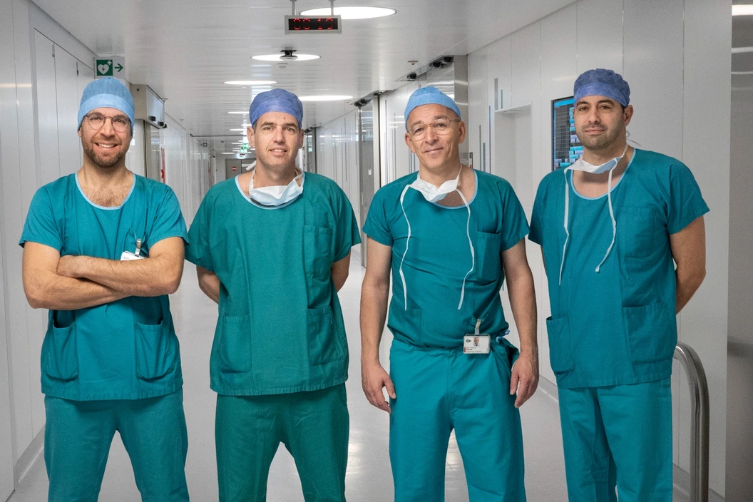 Sur la photo [de gauche à droite] : Pr Jean Yannis Perentes, médecin chef ; Pr Michel Gonzalez, médecin chef ; Pr Thorsten Krueger, chef de service ; Dr Etienne Abdelnour, médecin associé